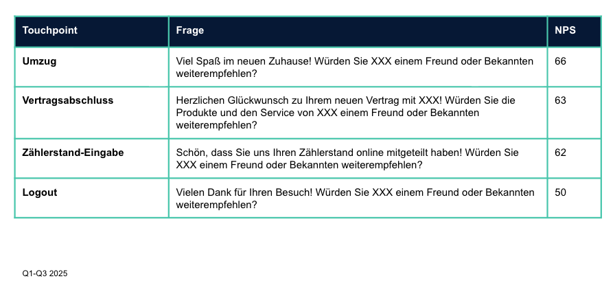 Besonders interessant ist, dass der Net Promoter Score nach einem Umzug mit 66 sogar höher ausfällt als nach dem Vertragsabschluss. Auch die Zählerstand-Eingabe erreicht mit einem NPS von 62 nahezu denselben Wert. Das zeigt, dass das Unternehmen gerade an diesen oft als kritisch empfundenen Touchpoints sehr gute Arbeit leistet und die Bedürfnisse der Kund:innen konsequent berücksichtigt.