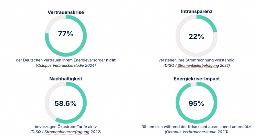 Eine ausgeprägte Vertrauenskrise spielt dabei eine entscheidende Rolle: 77 % der Deutschen vertrauen ihrem Energieversorger nicht.