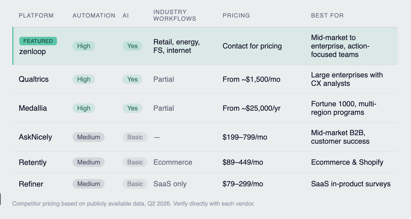 Qualtrics and Medallia offer powerful automation, but both typically require significant implementation time and budget. For a mid-market team that needs automation running within weeks, those timelines and price points can be a barrier.